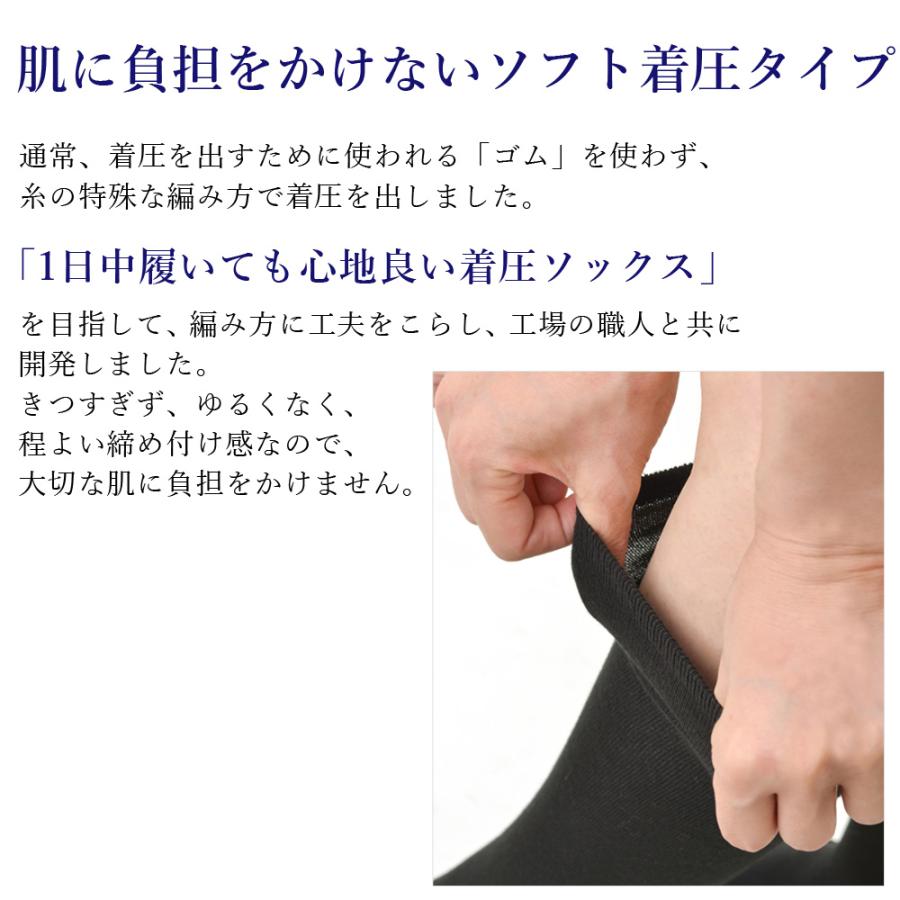 そんな想いから作られた着圧ハイソックスです。通常の着圧はゴムなどを使用しますが、糸の特殊な編み方で肌への負担が少ないソフトな着圧を実現しました。