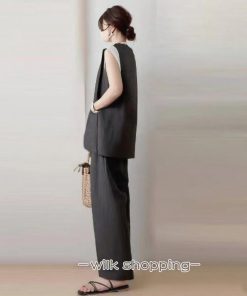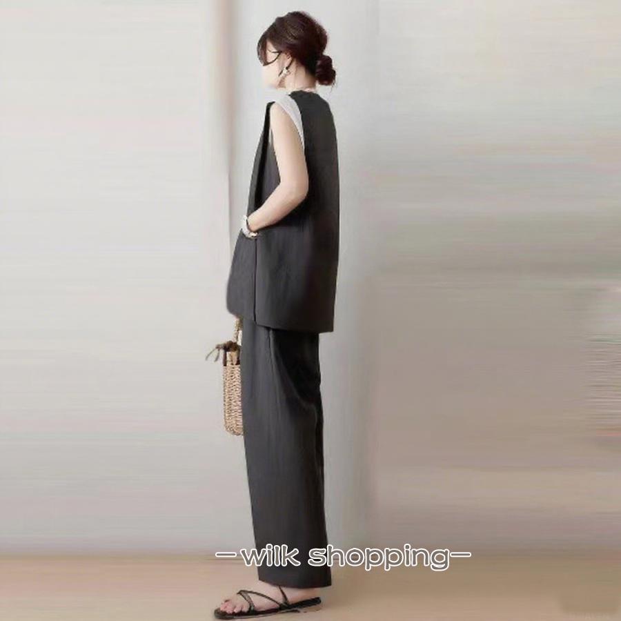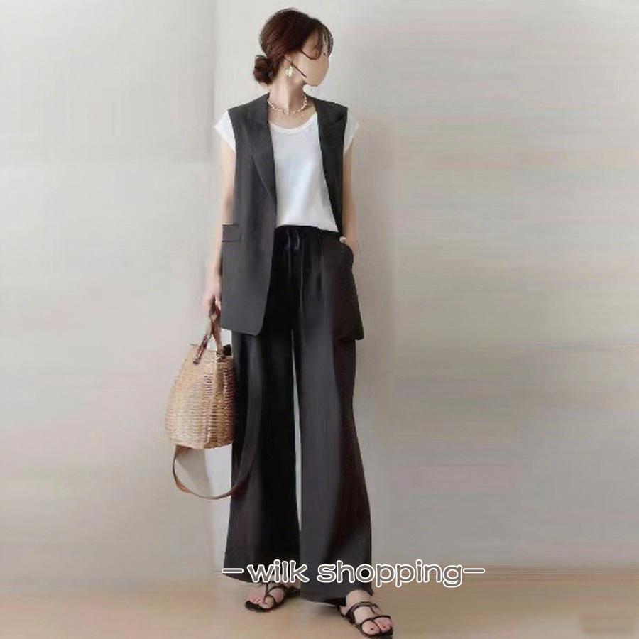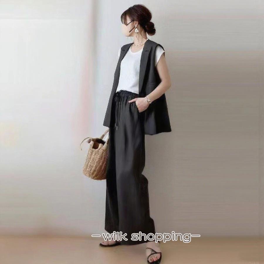 セットアップ 2点セット レディース ジャケット 袖なし 羽織り アウター ジレ ボトムズ ワイドパンツ ウエストゴム リボン ゆったり 無地 大人おしゃれ スーツ風
