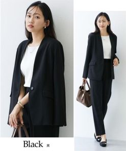 【素材】品質=[表地]ポリエステル95%・ポリウレタン5% [裏地]有(ジャケット:総裏 パンツ:ヒップ部)ジャケット:肩パッド有(取外し不可) 前ボタン開 ポケット両脇 袖口スリット パンツ:前ホック付ファスナー開 ウエスト後ゴム入 両脇ポケット・後飾り ※この商品は2点同サイズでのみ販売します。<洗濯方法>洗濯機OK ネット使用