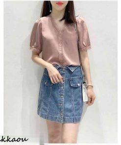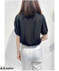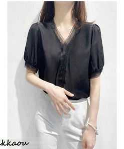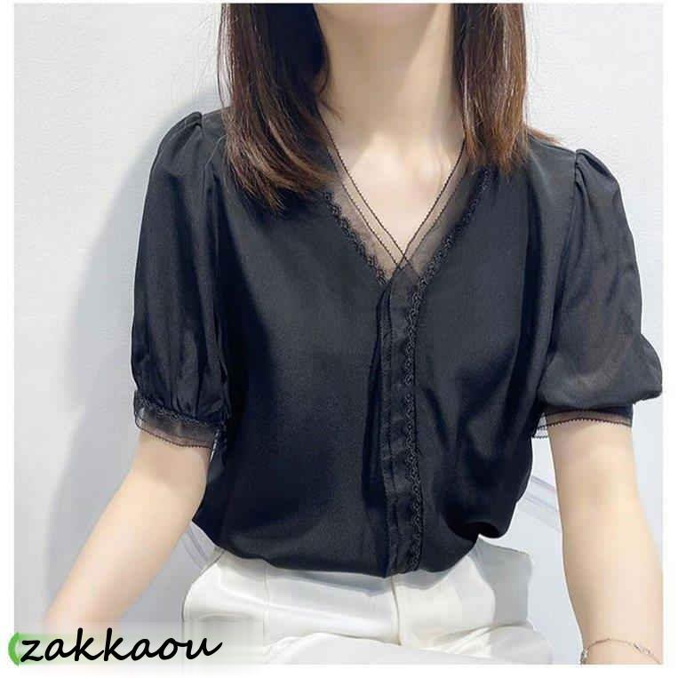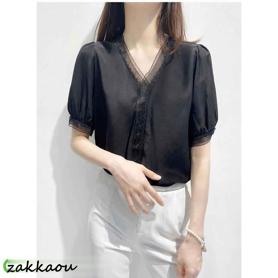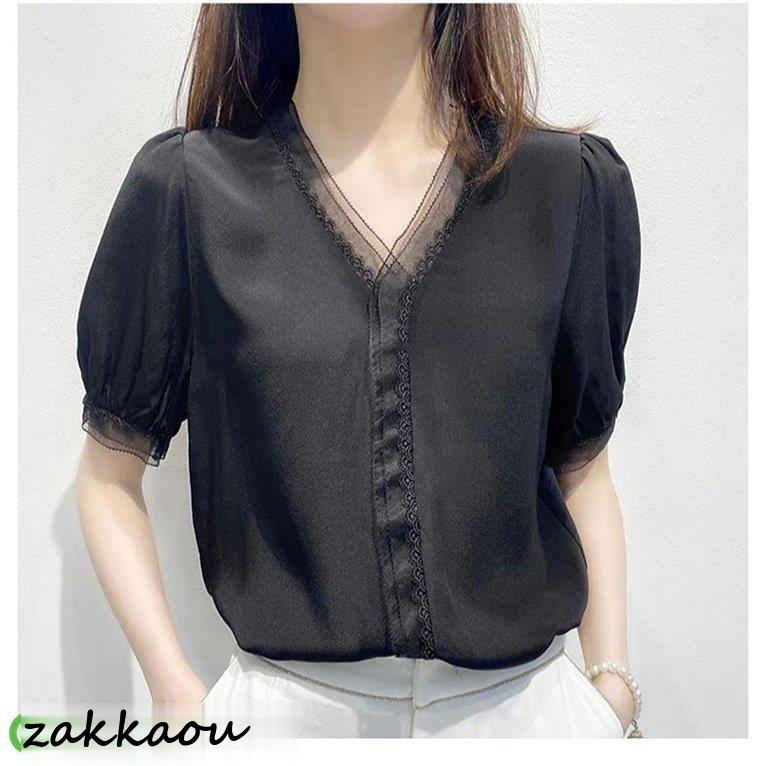 ブラウス レディース 40代 春夏新作 オシャレブラウス 白シフォンシャツ 大人通勤OL 半袖トップス シャツ30代 ゆったり レースVネックパフスリーブブラウス