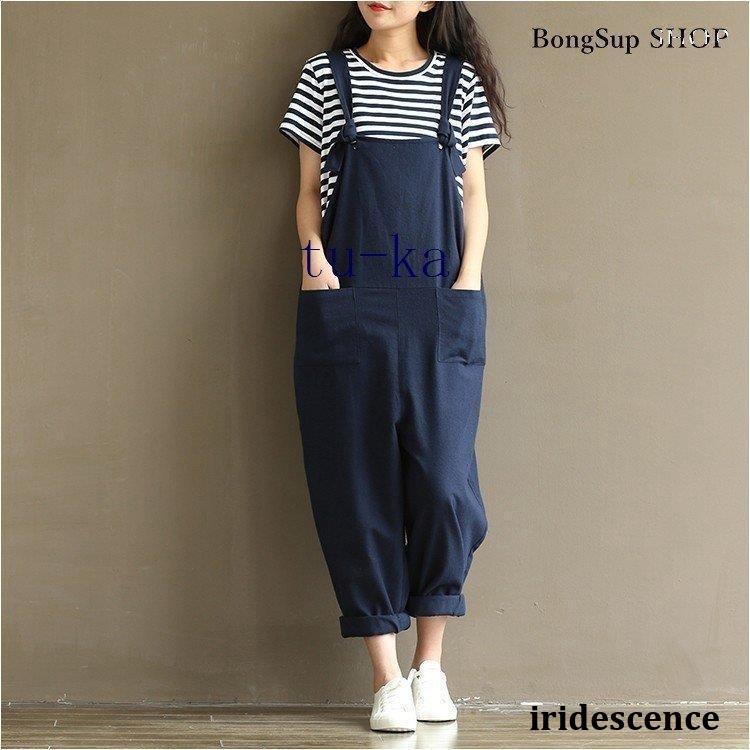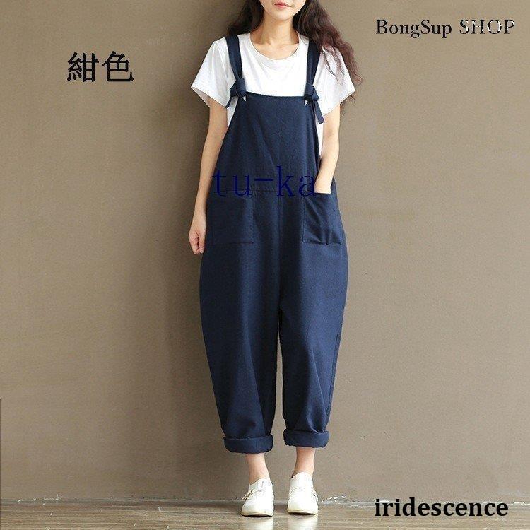 レディース 麻?リネン オーバーオール 綿麻混 ガウチョパンツ 夏 ロング ゆったり 大きいサイズ ポケット付き きれいめ カジュアル 通勤 着痩せ