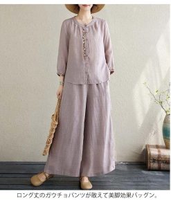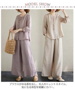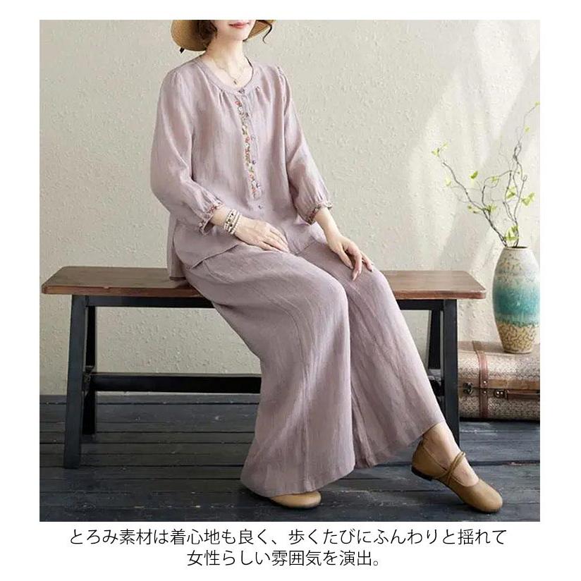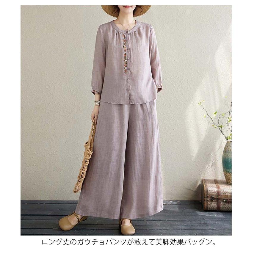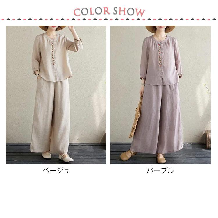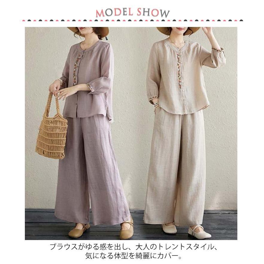 ワイドパンツ 春 長袖 レディース ブラウス 定番 シャツ 夏 体型カバー 部屋着 上下セット セットアップ カジュアル 綿麻タッチ きれいめ お洒落