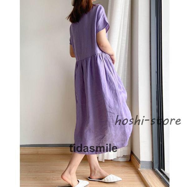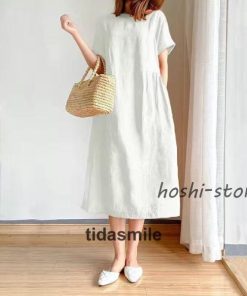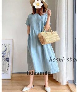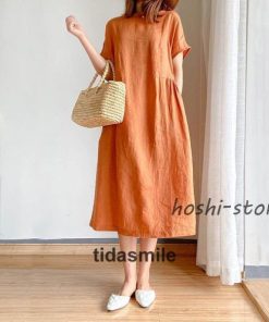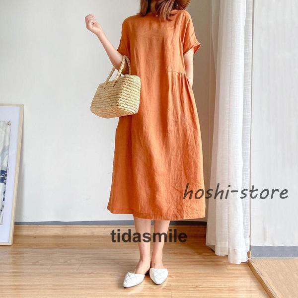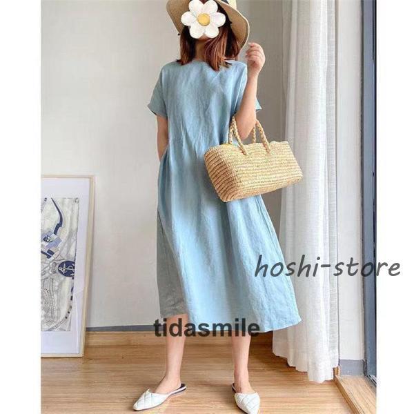 ワンピース ロング レディース リネン風 半袖 春 夏 きれいめ カジュアル ゆったり 体型カバー 膝丈 30代 40代 着痩せ シンプル おしゃれ