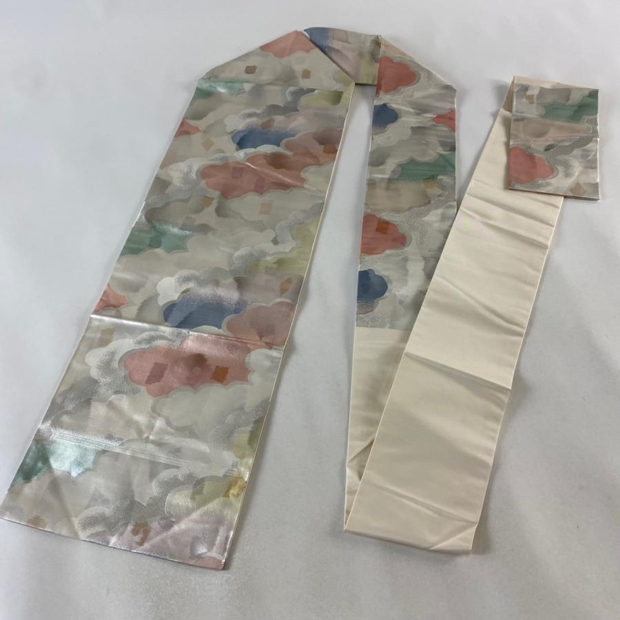 名古屋帯 優品 雲文 箔 灰白 正絹 中古