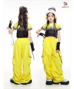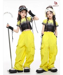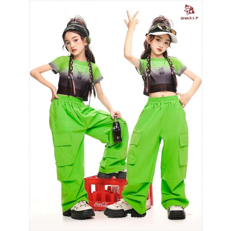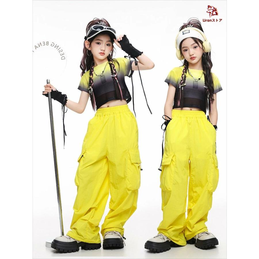 4色 タイダイ柄 短トップ 半透明 ショート丈トップ キッズ ダンス衣装 セットアップ 女の子 jazz チア チアガール 半袖 ゆったり へそ出し トップス カーゴパン