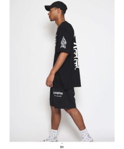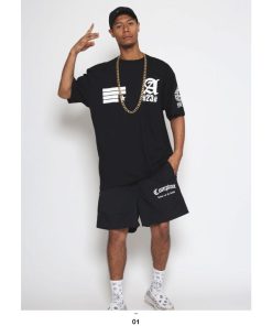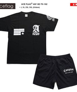 ゲームシャツ風のマルチロゴをドロップしたTシャツとComptonをドロップしたナイロンハーフパンツの上下セット。全1色。