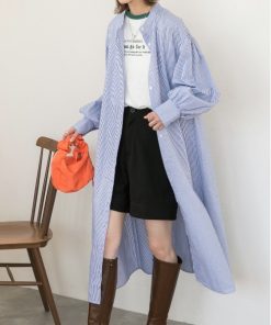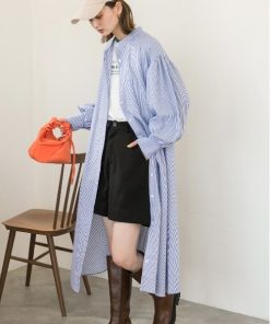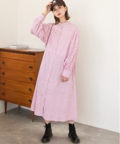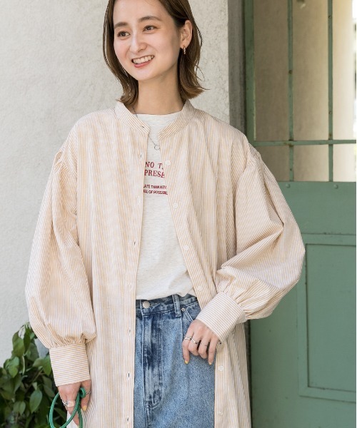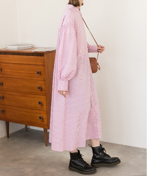 参考商品名:バルーンスリーブバンドカラーシャツワンピース 無地ストライプ