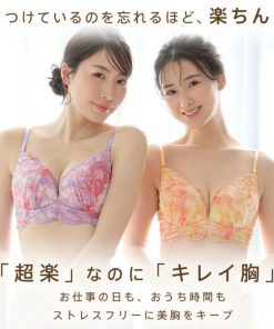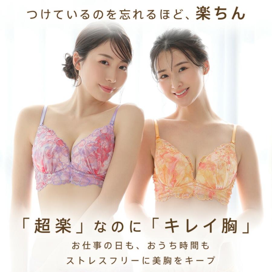 楽なのにふっくらキレイ胸をかなえる「aimerfeel 楽ブラ(R)」。こちらはチュール生地に淡い花柄をプリントし、その上から大きな花柄を刺繍することで透明感のあるデザインに仕上げたブラジャーです。もっちりとした伸縮性となめらかな素材が身体に快適にフィットし、ソフトワイヤーとやわらかカップのやさしいつけ心地が、ナチュラルでふっくらとしたキレイ胸をメイク。パットがなければ自然な美胸、パットを入れるとふんわり谷間とお好みで質感を調整できます。ブラとショーツのフロント中央にはダイヤモンド型のジュエリーで輝きをプラス。カラー展開はオレンジとパープルなどです。