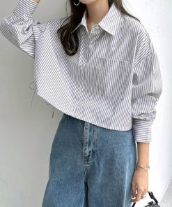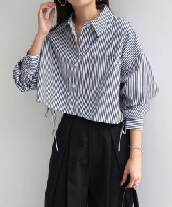 キーワード:ブラウス シャツ レディース ショート丈 ストライプ リボン レギュラーカラー 長袖 無地 WEB限定 デート ドライブ フェミニン 韓国ファッション 秋 大人カジュアル 旅行