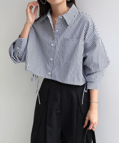 商品名:無地/ストライプショート丈リボンシャツブラウス