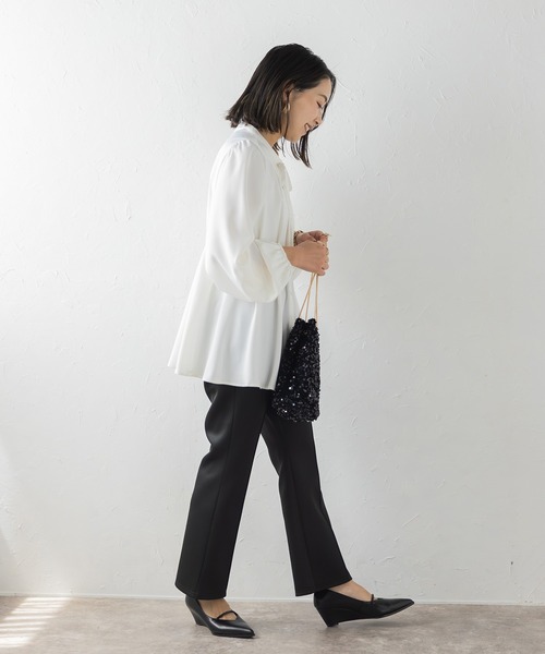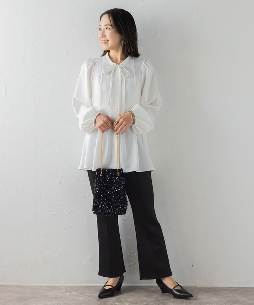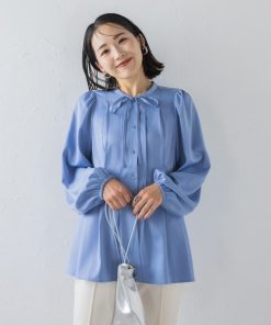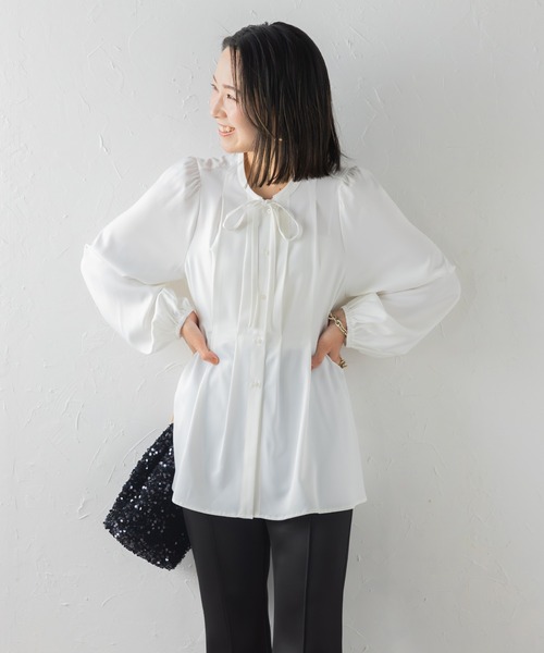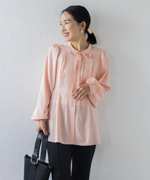 キーワード:ブラウス シャツ レディース ボウタイ 長袖 無地 冷感 キレイめ フェミニン 大人カジュアル