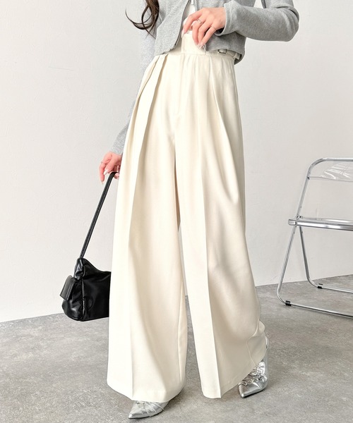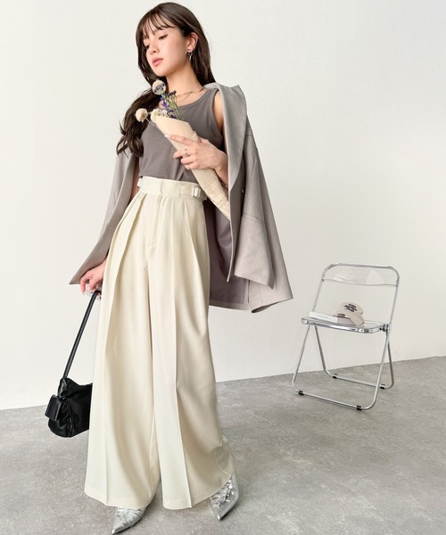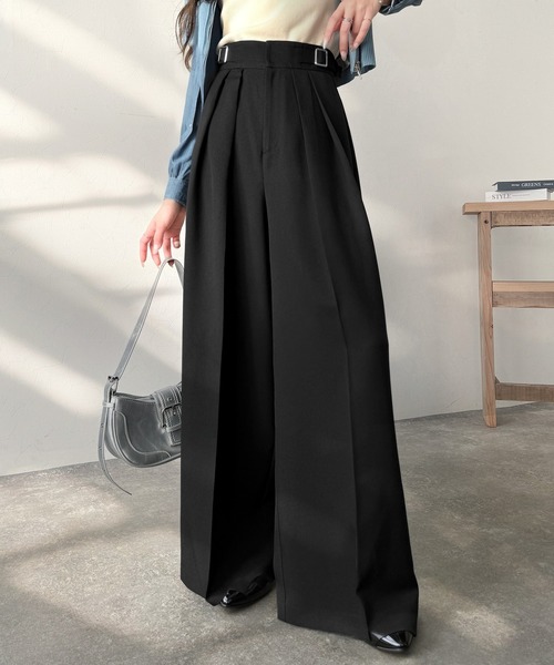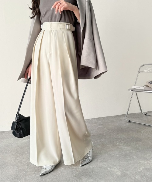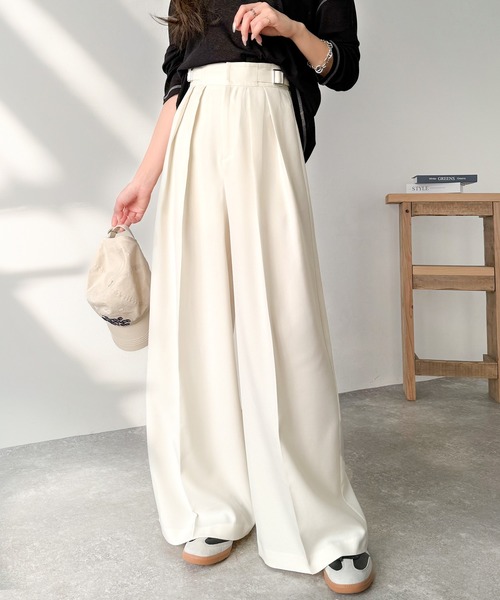 商品名:上品なシルエットの優秀パンツ♪サイドベルトハイウエスト2タックワイドパンツ