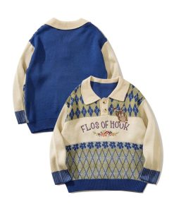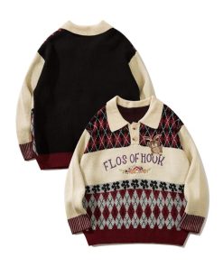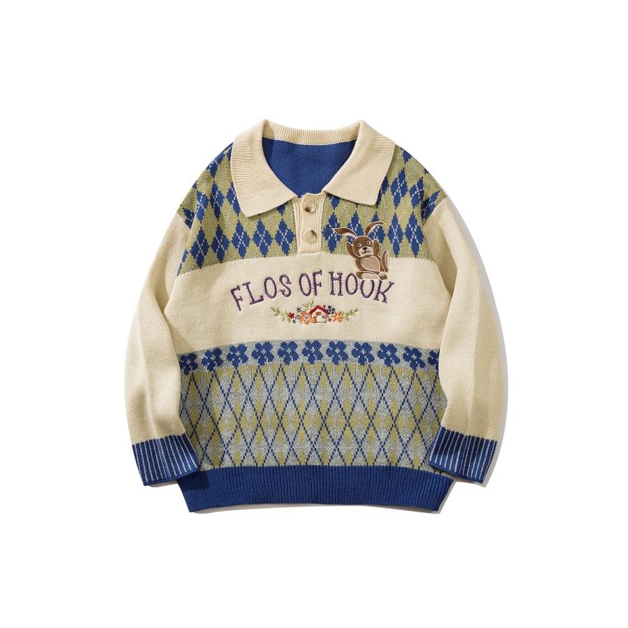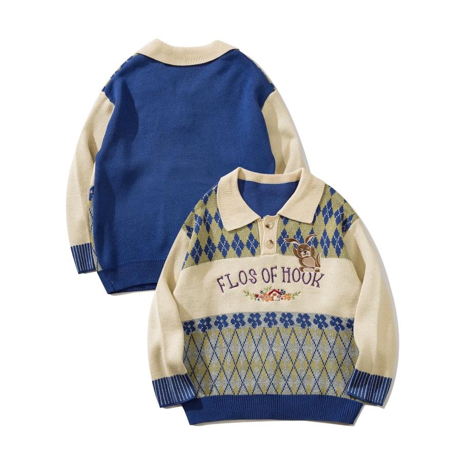 商品名:HOOK -original- 古着風 レトロ調うさぎ刺繍配色アーガイル柄ポロ襟ニット