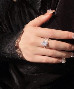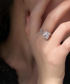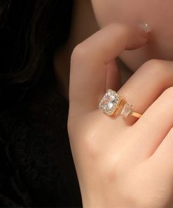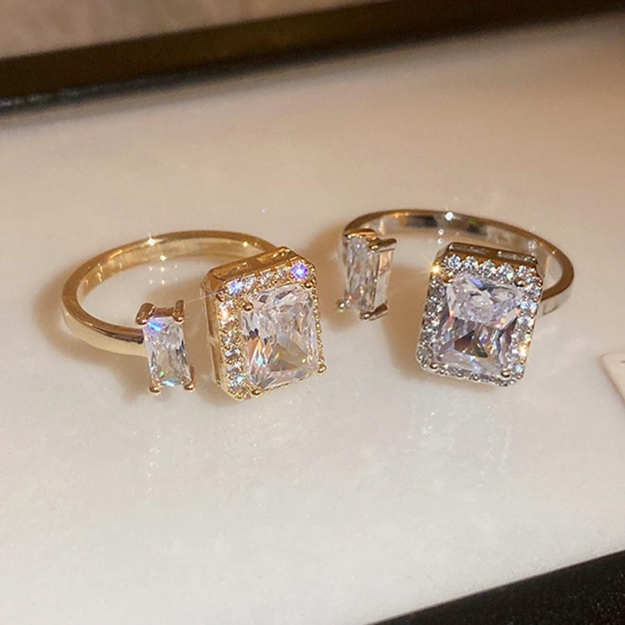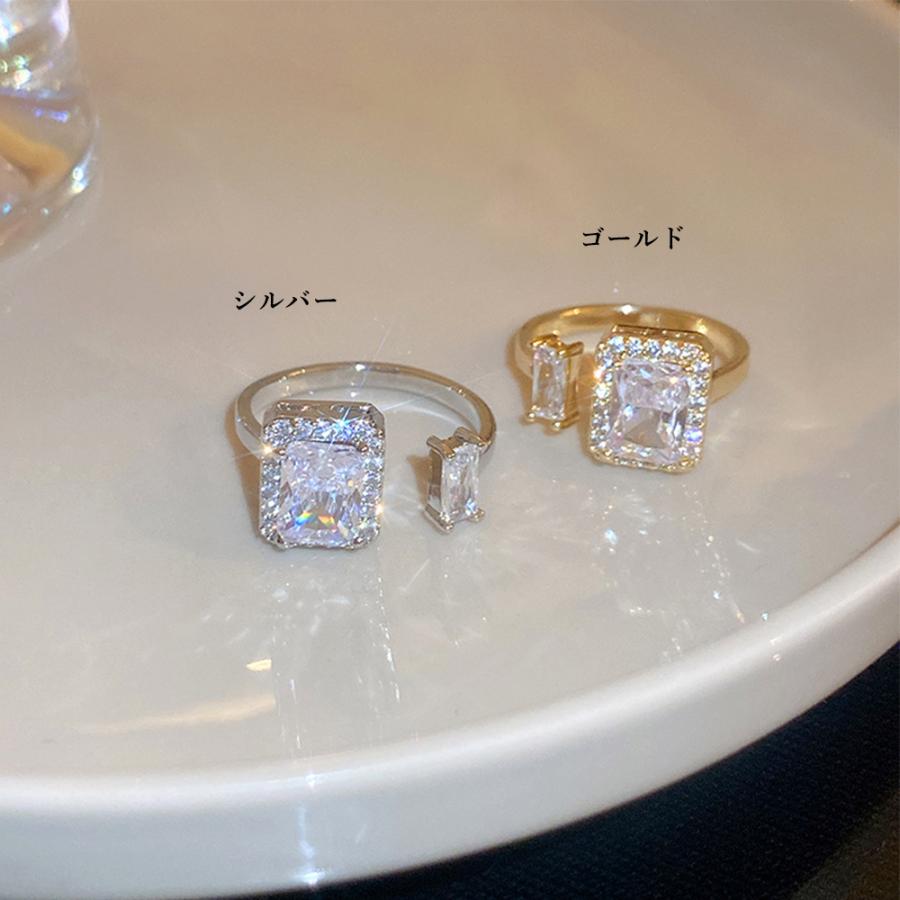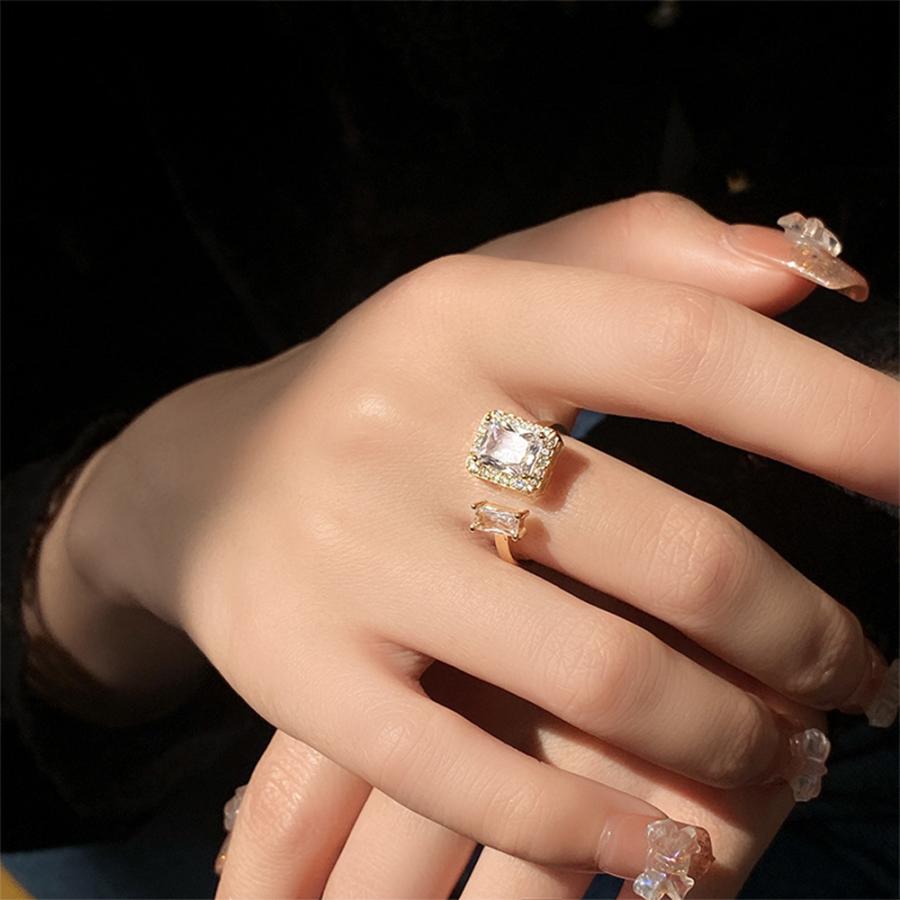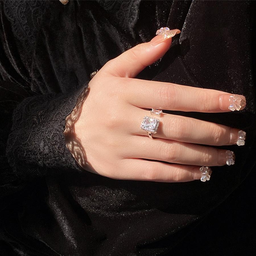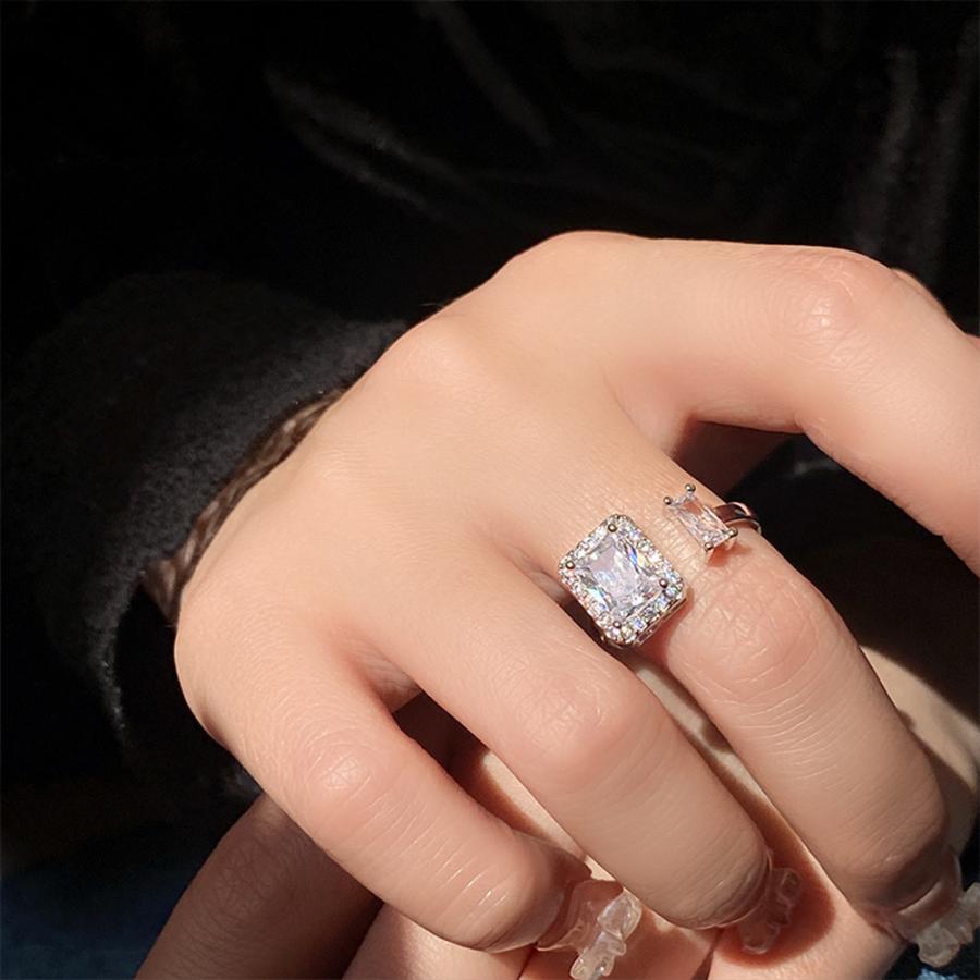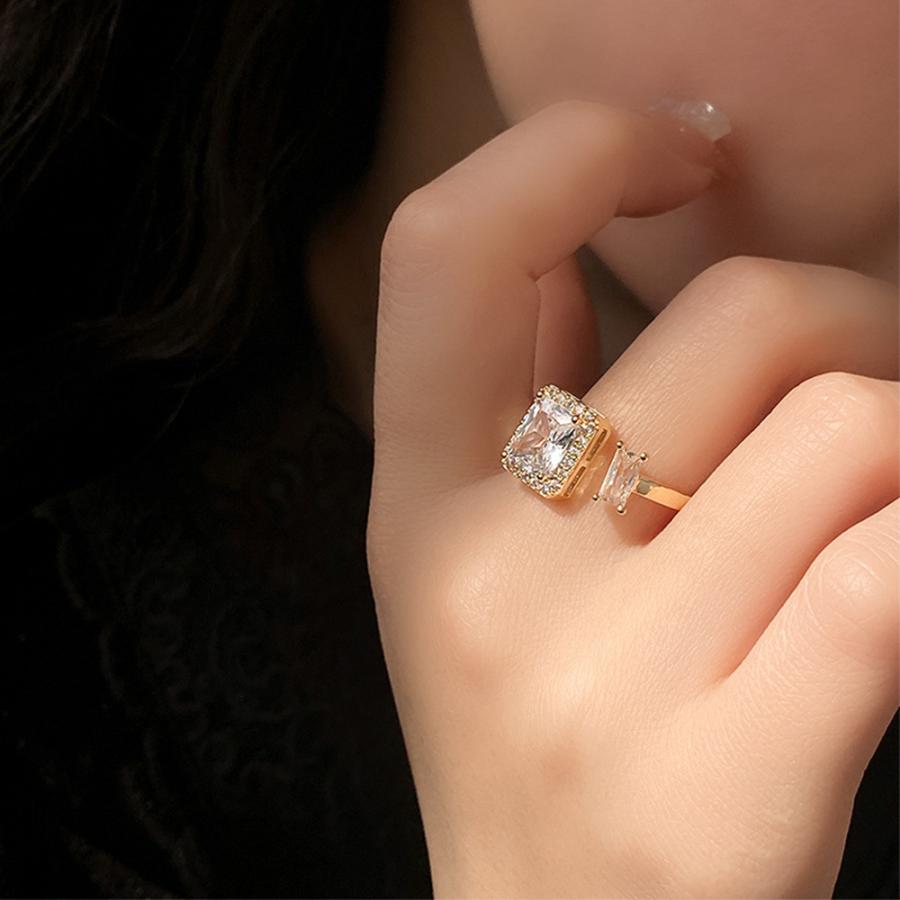 透明感のある煌めきが上品な雰囲気を放つ、端正なスクエア型フェイクダイヤはシャープで洗練された印象を与えるフリーサイズリング