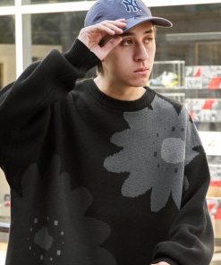 キーワード:セーター ニット メンズ クルーネック ロング丈 花柄 長袖 秋 冬