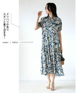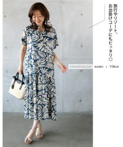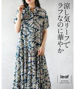OTONA 涼し気リーフでラフなのに華やか ティアードワンピース 柄 ボタニカル 半袖 薄手 軽い ロング丈 ミドル丈 春夏 ブルー 40代 50代 60代