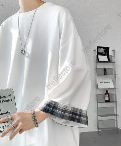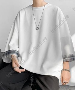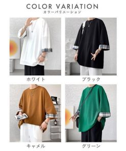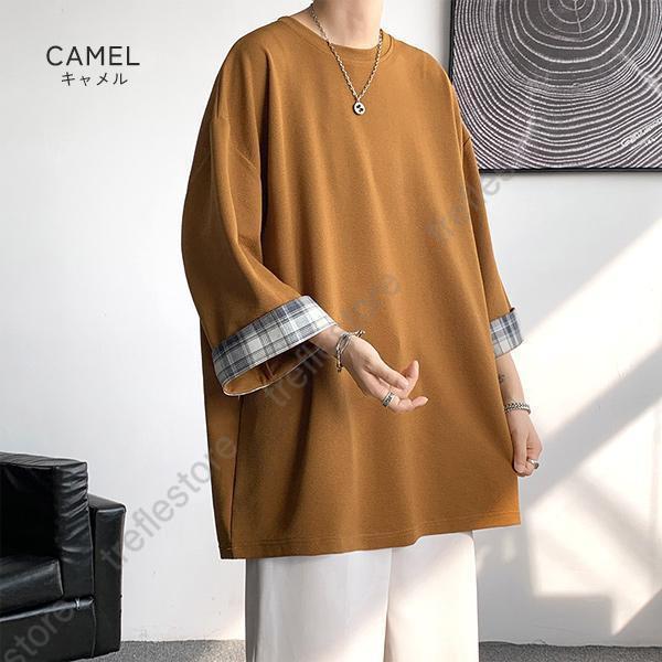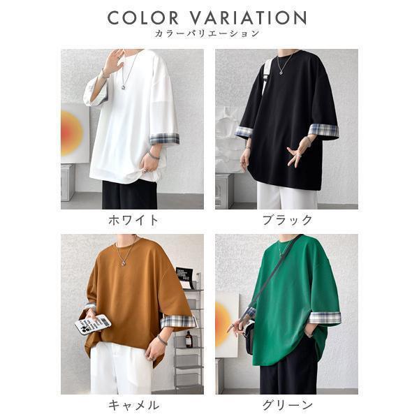 Tシャツ メンズ トップス 七分袖 半袖 ロング 長め ビッグシルエット 大きめ オーバーサイズ チェック柄 クルーネック 無地 お洒落 春 夏 秋