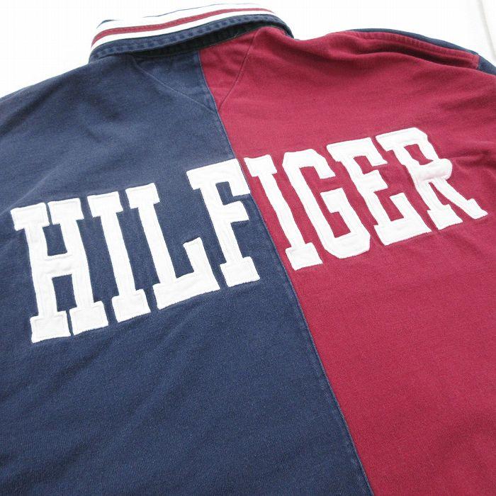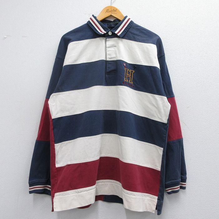 【商品名】 L★古着 トミーヒルフィガー 長袖 ブランド ラガー シャツ メンズ 90年代 90s ビッグロゴ コットン 紺他 ボーダー【spe】