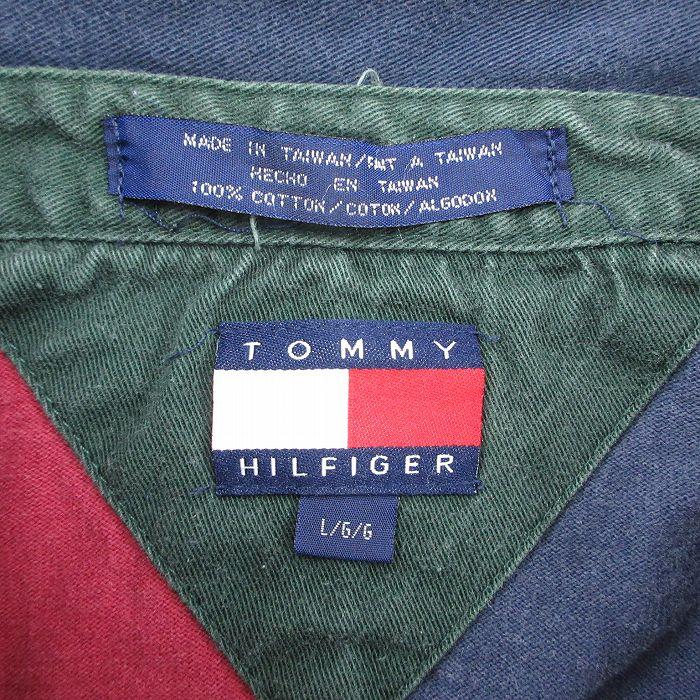 TOMMY HILFIGER L/古着 トミーヒルフィガー 長袖 ブランド ラガー シャツ メンズ 90s ビッグロゴ コットン 紺他 ネイビー ボーダー spe 25fe