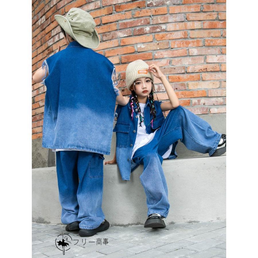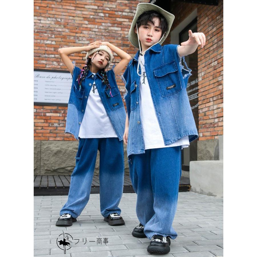 キッズ ダンス衣装 ヒップホップ 派手 デニムベスト デニムパンツ ハーフパンツ 白タンクトップ ダンス発表会 ブルー グラデーション デニム柄 男の子 ガールズ K-POP 団体服 チーム服 韓国 ステージ衣装 演出服 110?180cm jazz おしゃれ