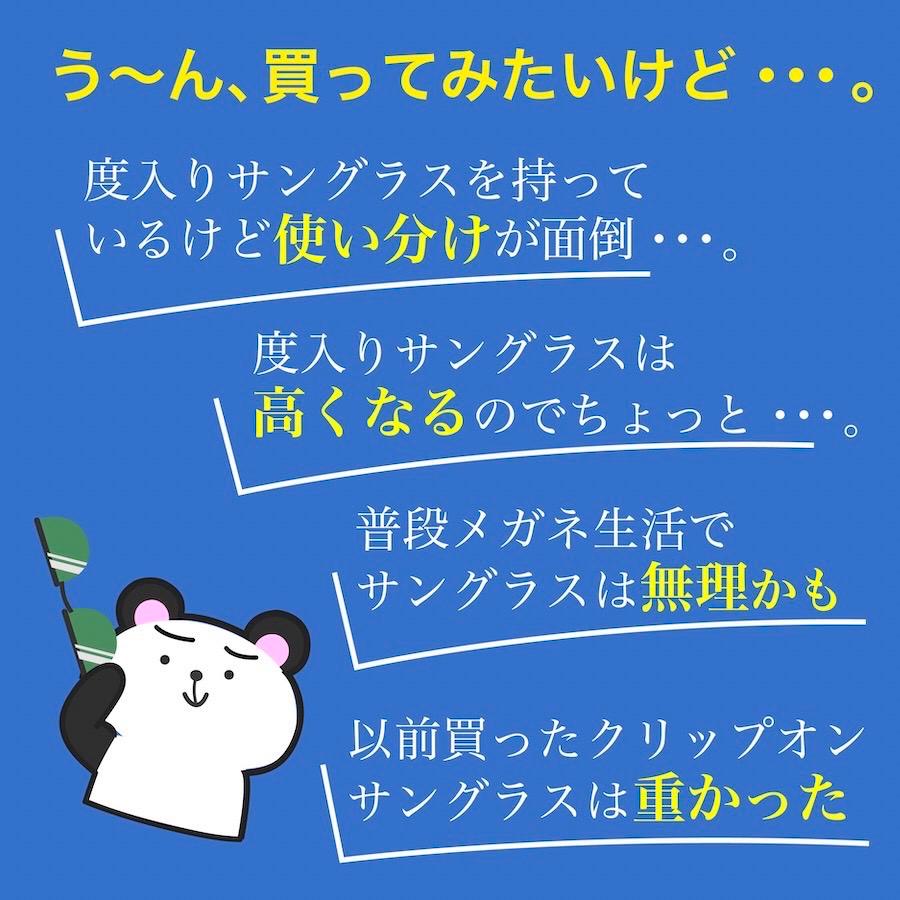 メガネにクリップオンサングラスを付けるだけで、簡単にサングラスに変わります。別途購入の必要なし