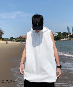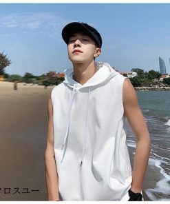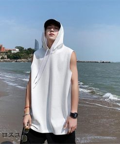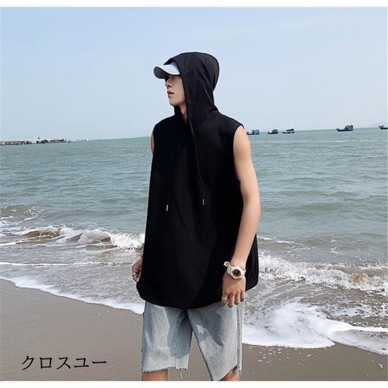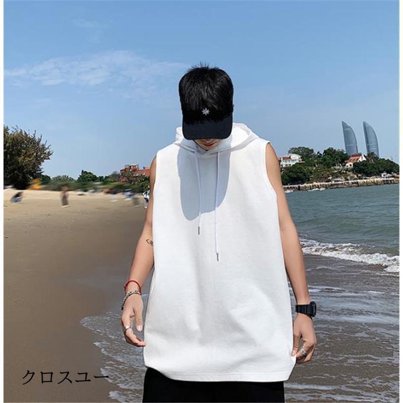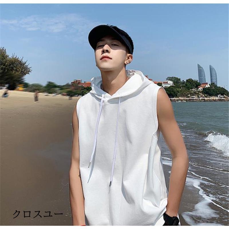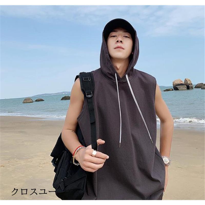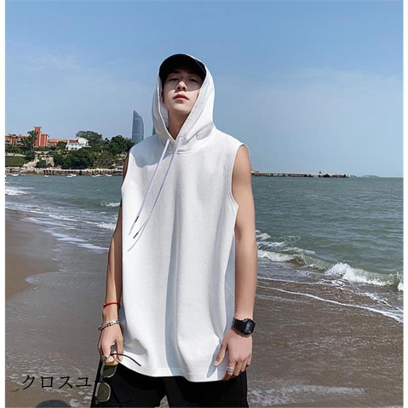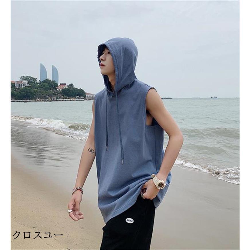タンクトップ パーカー メンズ Tシャツ フード付き ノースリーブ カジュアル トップス 重ね着 薄手 無地 スポーツ トレーニング 春夏 おしゃれ