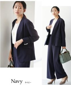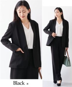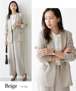 【素材】品質=[表地]ポリエステル95%・ポリウレタン5% [裏地]有(ジャケット:総裏 パンツ:ヒップ部)ジャケット:肩パッド有(取外し不可) 前ボタン開 ポケット両脇 袖口スリット パンツ:前ホック付ファスナー開 ウエスト後ゴム入 両脇ポケット・後飾り ※この商品は2点同サイズでのみ販売します。<洗濯方法>洗濯機OK ネット使用