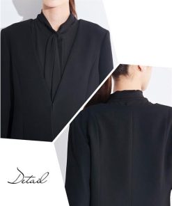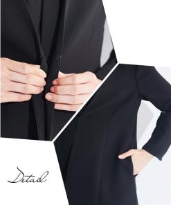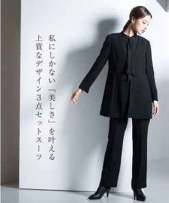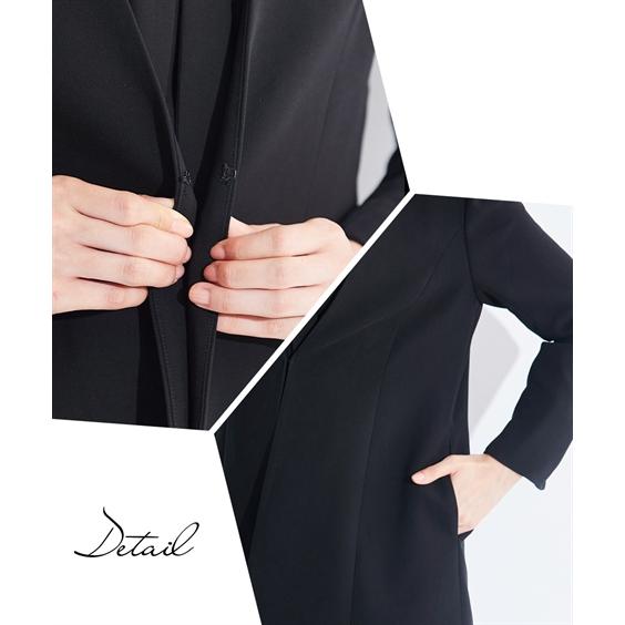 【素材】品質=[表地]ジャケット・パンツ:ポリエステル100%(二重織)ブラウス:ポリエステル100%(シフォン)【裏地】有(ジャケット:総裏 ブラウス:身頃部 パンツ:無) ジャケット:前ホック開 ポケット両脇 袖口スリット ブラウス:前ファスナー開 袖口ボタン開 パンツ:前ファスナー内ホック開 ウエスト後ゴム入 ポケット両脇 ※この商品は3点同サイズのみで販売します。