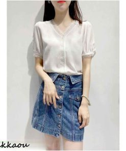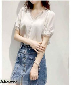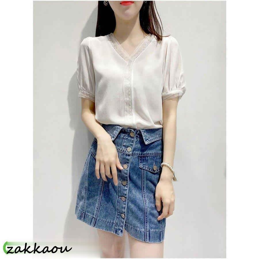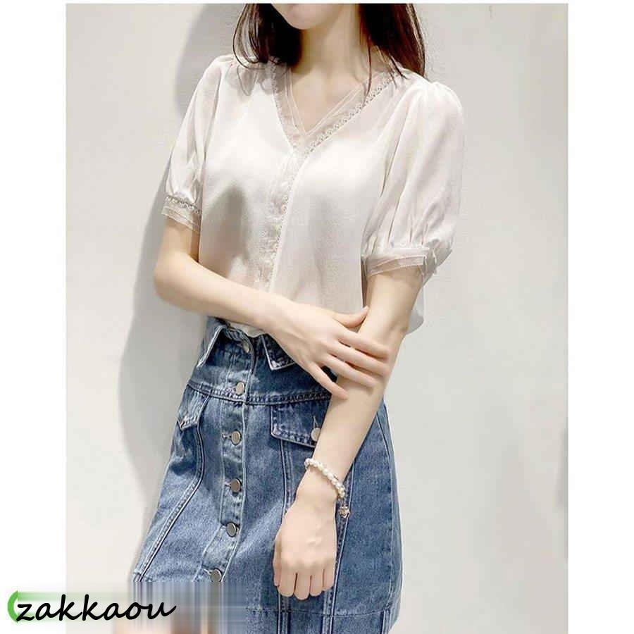 ブラウス レディース 40代 春夏新作 オシャレブラウス 白シフォンシャツ 大人通勤OL 半袖トップス シャツ30代 ゆったり レースVネックパフスリーブブラウス