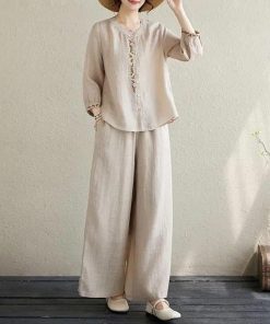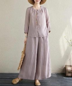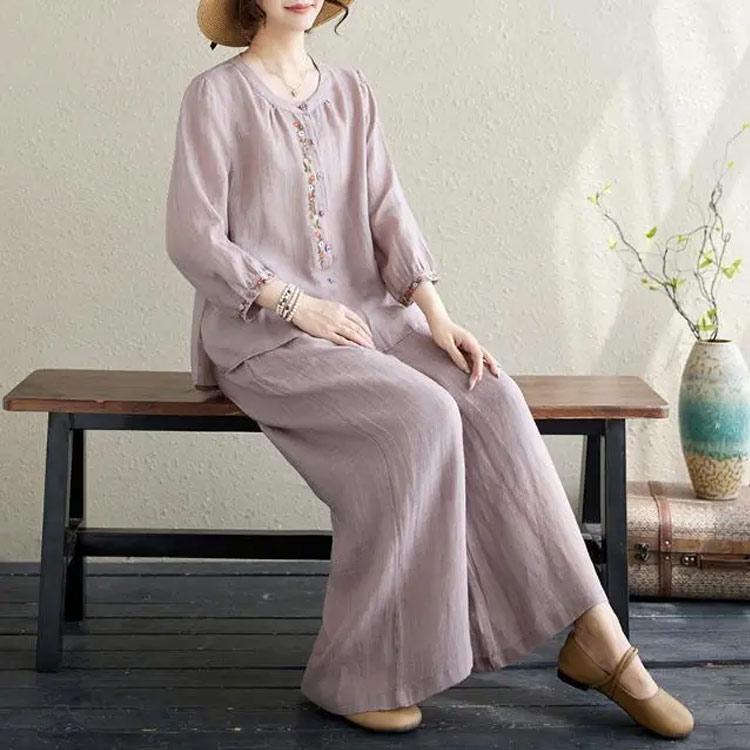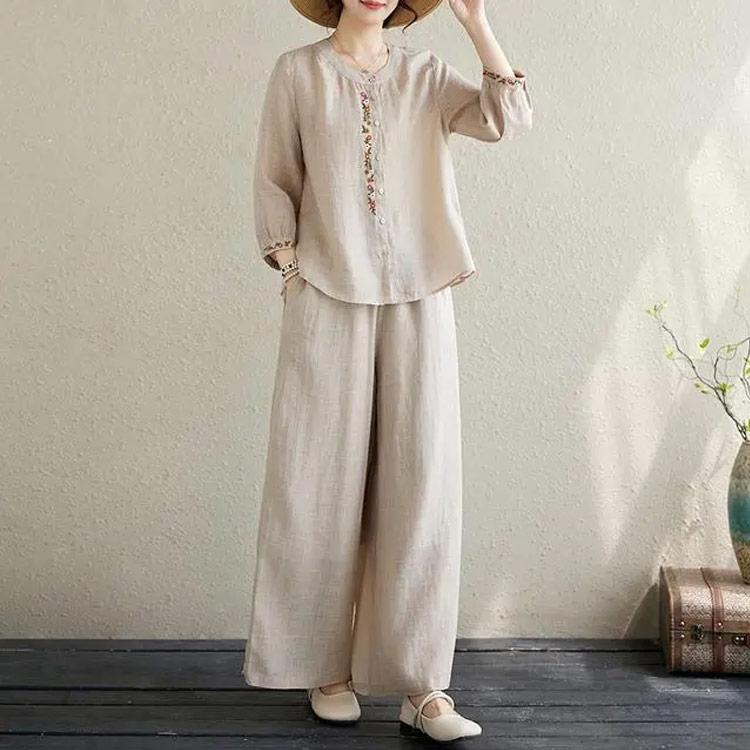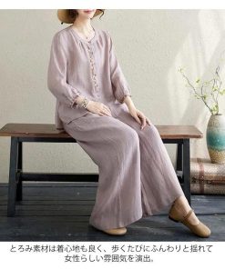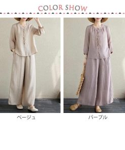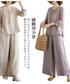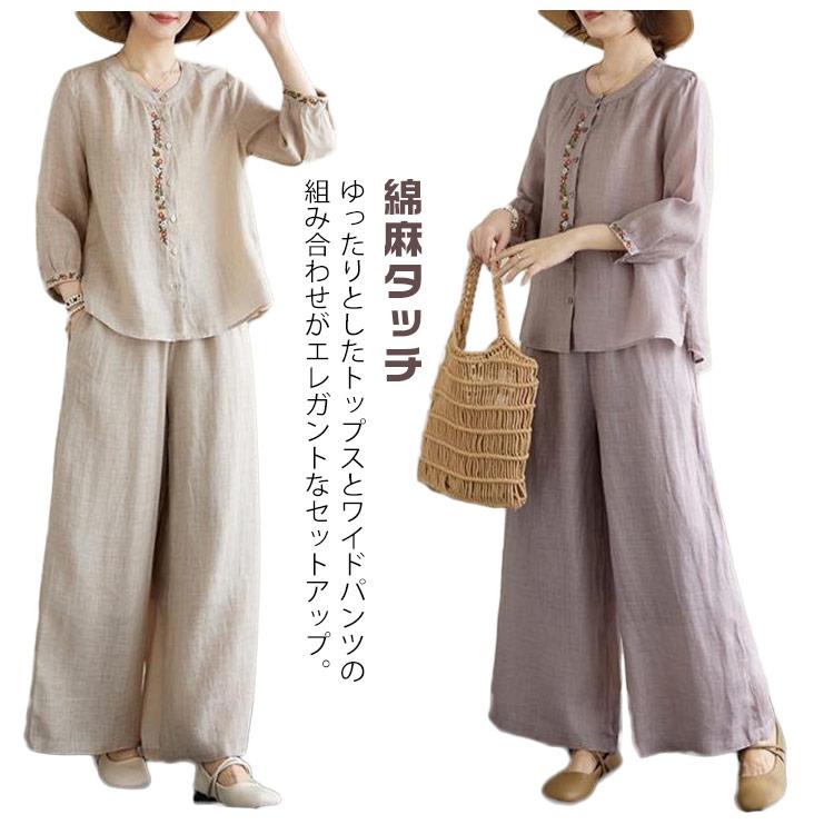 ワイドパンツ 春 長袖 レディース ブラウス 定番 シャツ 夏 体型カバー 部屋着 上下セット セットアップ カジュアル 綿麻タッチ きれいめ お洒落