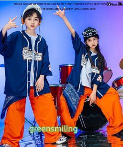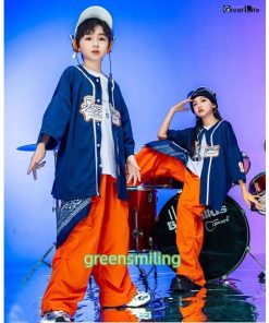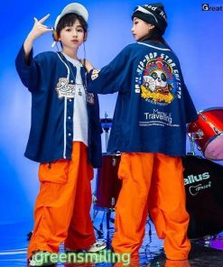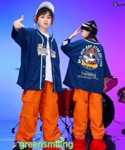 紺色 ベースボールシャツ オレンジ カーゴパンツ キッズダンス衣装 セットアップ 半袖 トップス ゆったり tシャツ 男の子 女の子 韓国 ダンス衣装 k-pop ジャズ