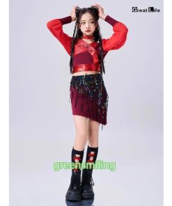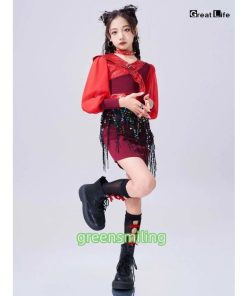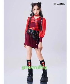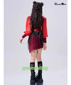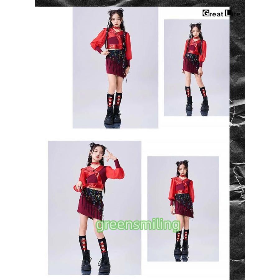 赤 トップス スカート ベルト レッグウォーマー キッズ ダンス衣装 セットアップ 上下セット おしゃれ 女の子 韓国 jazz かわいい かっこいい へそ出し ファショ