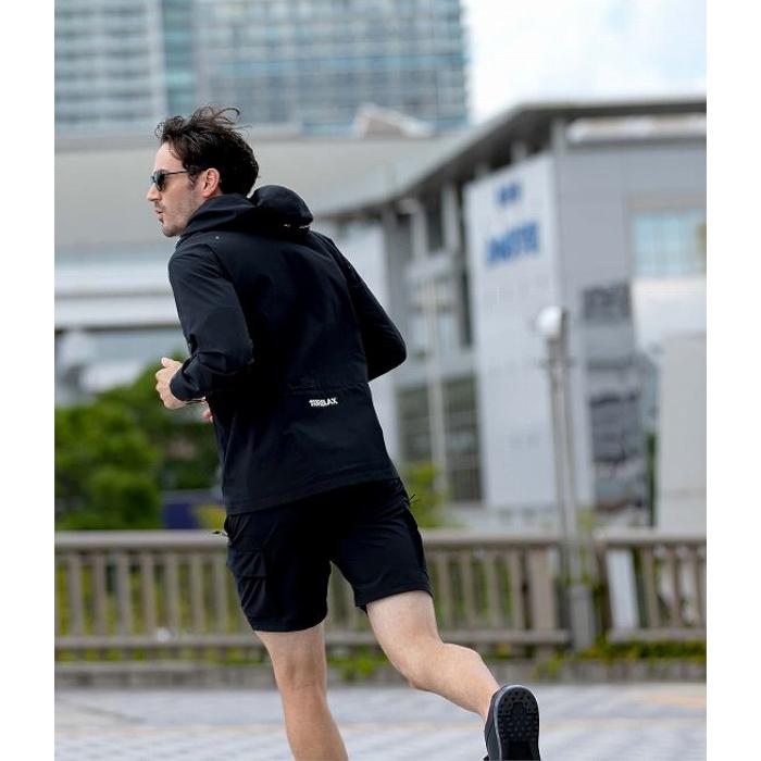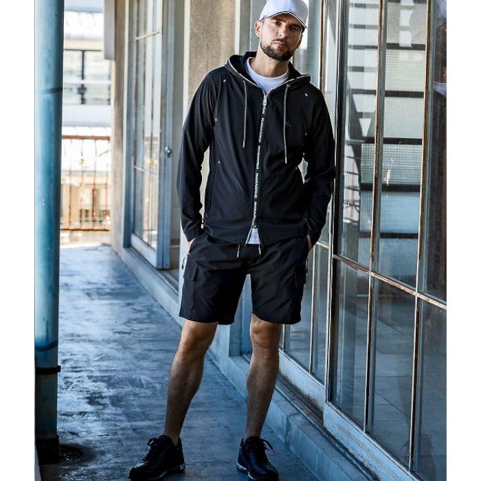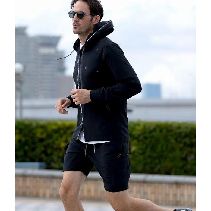軽量かつ高いストレッチ性でウォーキングやトレーニングなどアクティブなシーンに活躍するセットアップ。フロントとバックにリフレクタープリントを施し夜間の安全性も確保。デザイン性、機能性ともに申し分なくタウンユースにも映える一着。