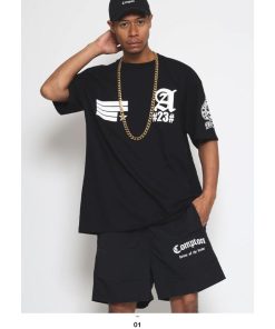 ゲームシャツ風のマルチロゴをドロップしたTシャツとComptonをドロップしたナイロンハーフパンツの上下セット。全1色。