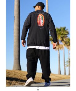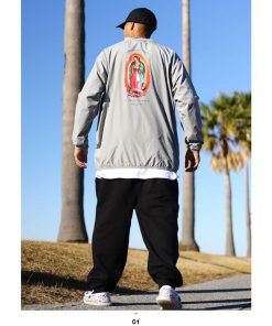 聖母マリア像のモチーフをドロップしたピステ(ナイロンジャケット)とスウェットロングパンツの上下セット。全2色。