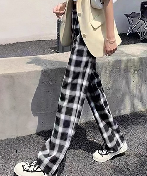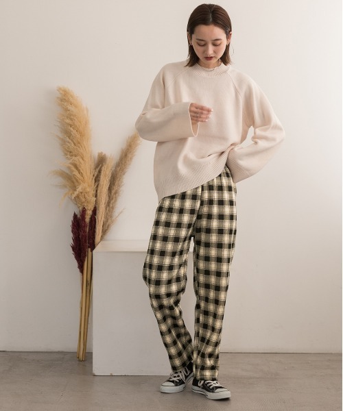 キーワード:パンツ レディース ウエストゴム スタンダード ストレート チェック ハイウエスト フルレングス