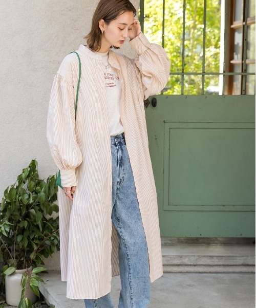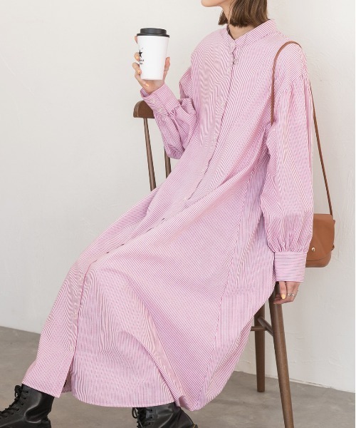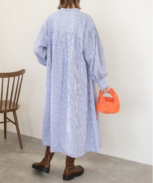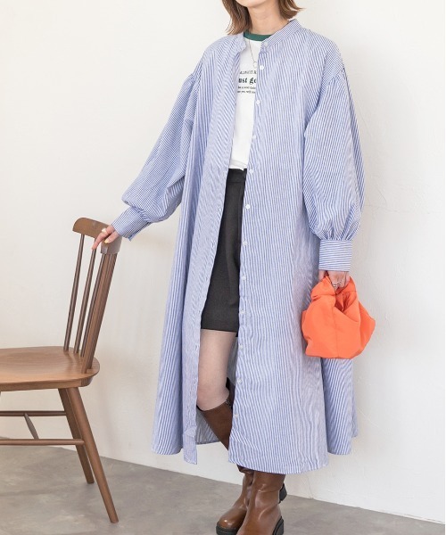 参考商品名:バルーンスリーブバンドカラーシャツワンピース 無地ストライプ