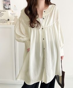 キーワード:ブラウス シャツ レディース レギュラーカラー ロング丈 長袖 無地 プチプラ ベーシック 公園 紅葉 大人カジュアル