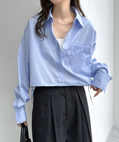 商品名:無地/ストライプショート丈リボンシャツブラウス