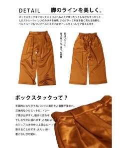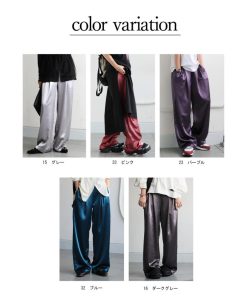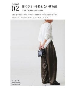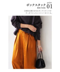 落ち感のある高級サテン素材にボックスタックを効かせた美脚見えワイドパンツ。体型カバーと脚長効果を両立しつつ、ウエストゴム仕様でリラクシーな着用感。10色展開で日常使いにもぴったり。