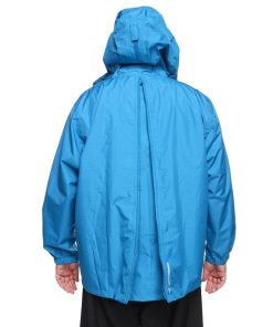 仕様:トップスポケット×2つ / シングルジップ(ボタン) / フード収納可 / ウエスト調節ゴム / パンツ裾マジックテープで調節可能 / 撥水加工 / 反射プリント / バッグ30Lサイズまでまるごと収納対応