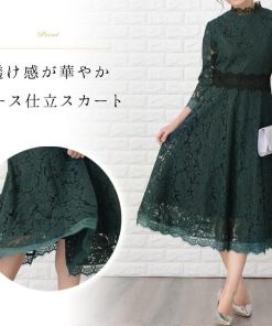 Lace Ladies パーティードレス 総レース ミモレ丈 ワンピース グリーン ドレス フレア 七分袖 レディースミディ丈 ロングドレス 膝下丈 袖あり