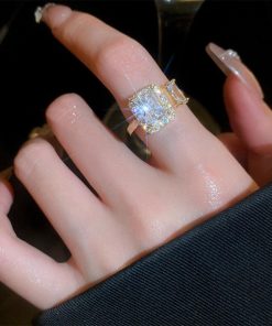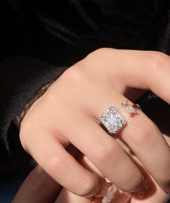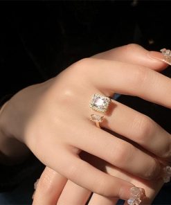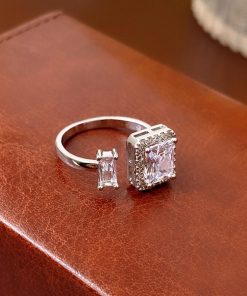 透明感のある煌めきが上品な雰囲気を放つ、端正なスクエア型フェイクダイヤはシャープで洗練された印象を与えるフリーサイズリング