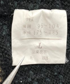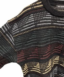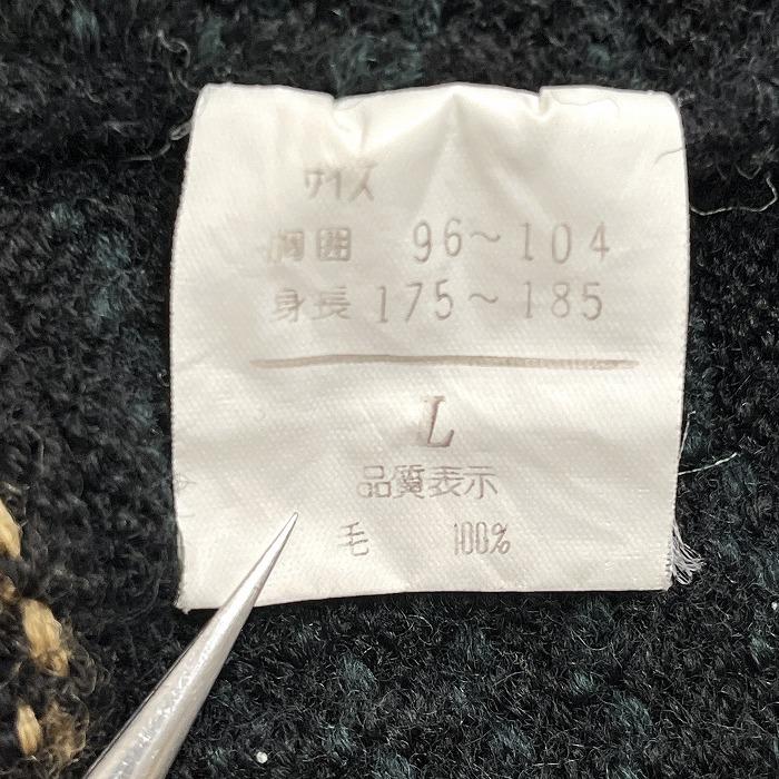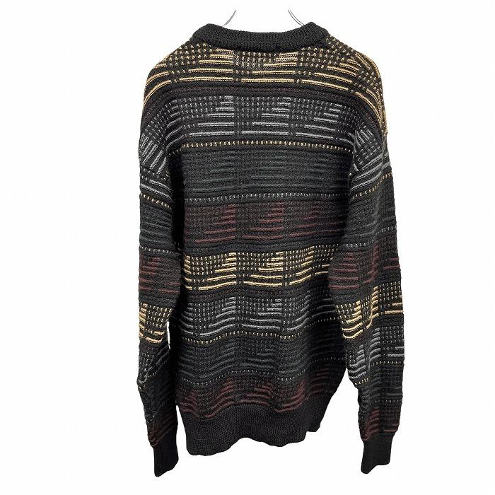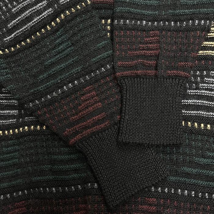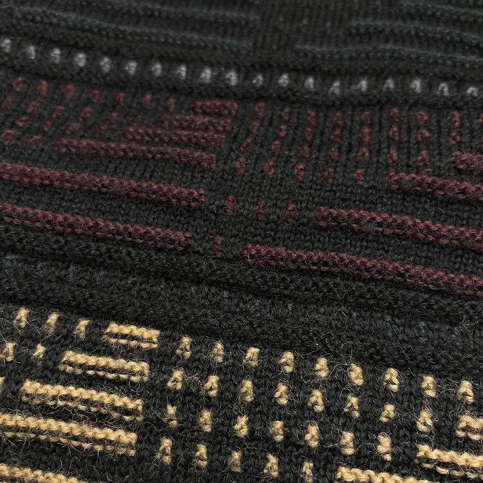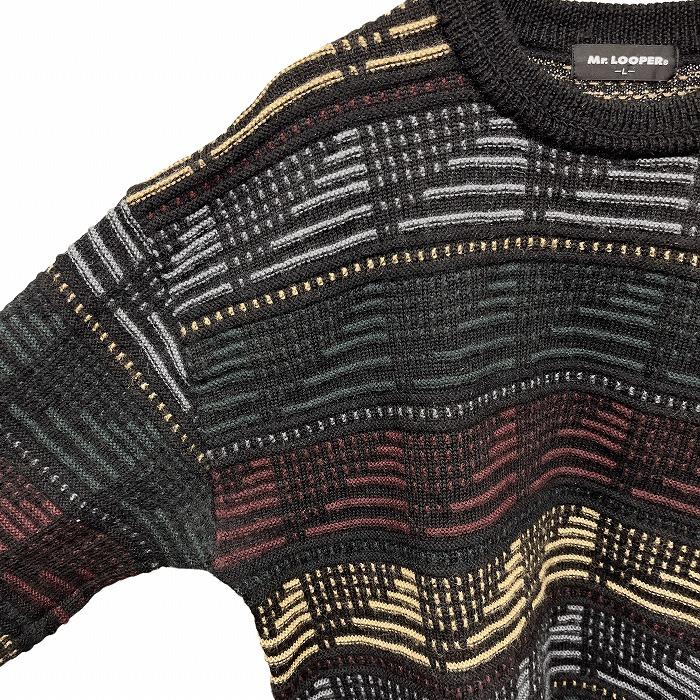 Mr. LOOPER セーター ウールカットソー レトロ柄 古着 長袖 丸首 日本製 ウール100% L ブラック 黒×緑×黄×赤茶×グレー メンズ