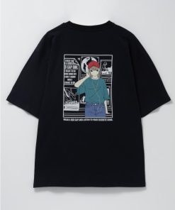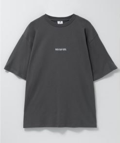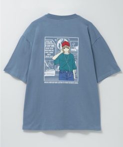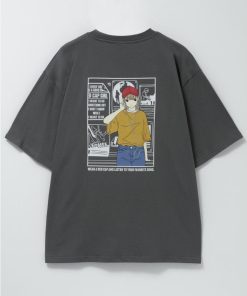 イヤホンで音楽を聴いている女の子のプリントが特徴的な半袖Tシャツ。