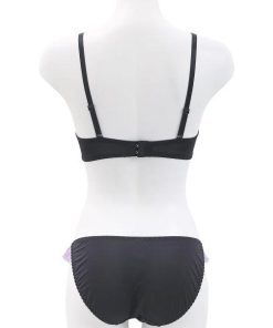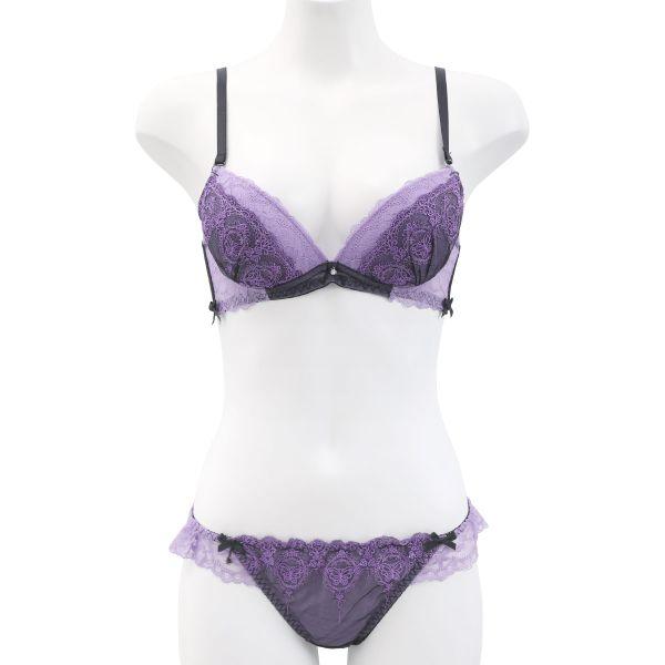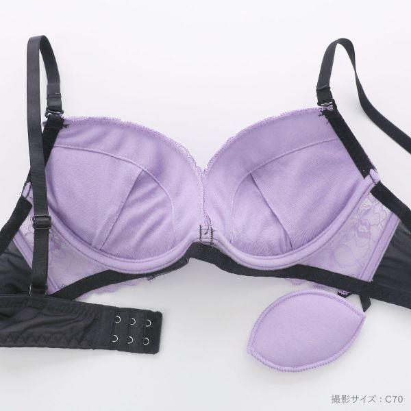 カラーレースにバタフライ模様のアーチ刺繍を重ね、ブラック&プチリボンで甘くダークに引き締めたブラショーツセット。かわいいだけじゃない毒っ気が色っぽいデザインです。
