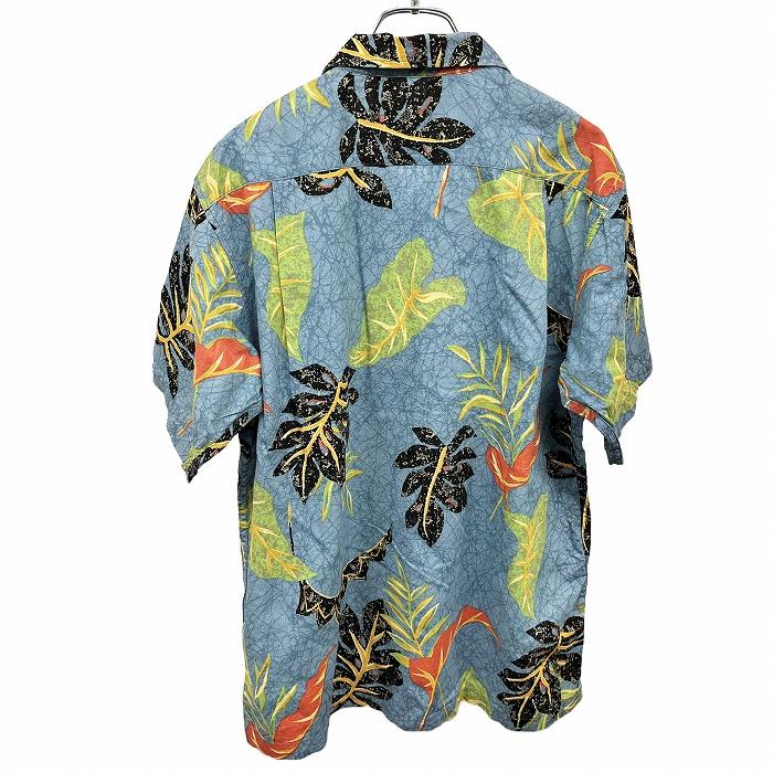 THE U.S. ROUTE 66 CLUB オープンカラーシャツ リーフ柄 植物柄 半袖 ボタニカル 胸ポケット 綿×麻 M ブルー 青×緑×黄×赤×黒 メンズ