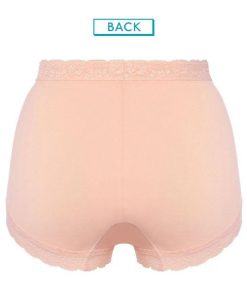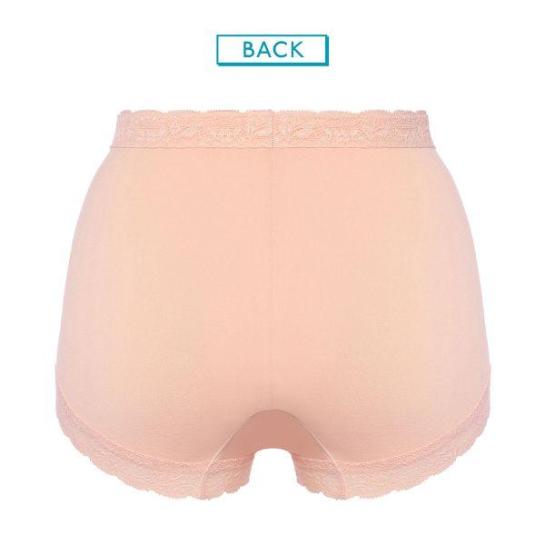 バックはセンターシームでヒップラインにぴったりフィット。インナーラベルは裏地にプリントタイプ。はきこみ丈は深めで、おなかすっぽり仕様です。